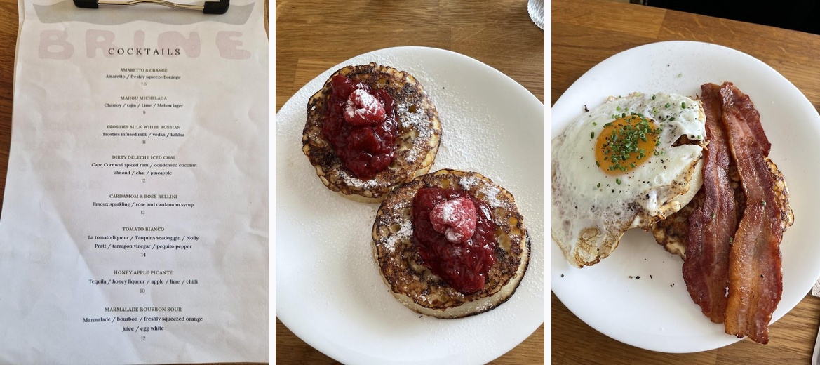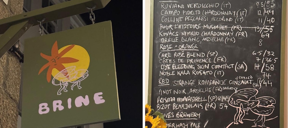 Brine serves all-day brunch options, oysters, and evening snacks. The menu features innovative twists on brunch classics like Eggy Crumpets and Eggs Benny.